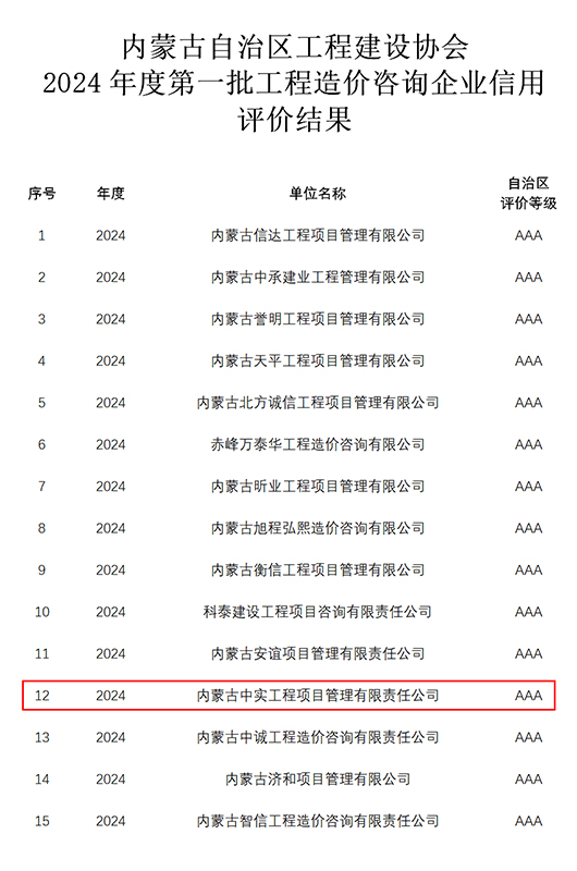 2024-07-3017175 次近期,我公司参加内蒙古自治区工程建设协会组织的“2024年度第一批工程造价咨询企业信用”申报,获得“信用AAA级证书”。我公司成立多年以来,遵循中国工程造价管理协会对造价咨询企…